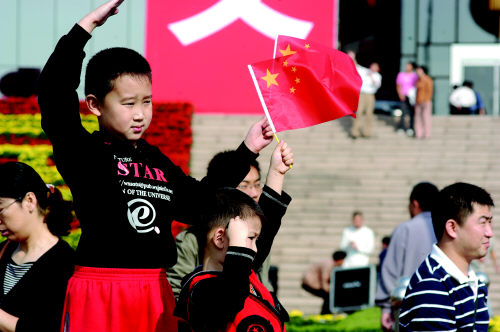 昨天清晨7時30分,離慶祝中華人民共和國成立56周年升國旗儀式開始還有1個小時,市民和游客就從四面八方聚攏到市政府前樓廣場,等待著五星紅旗迎風飄揚的那一刻。昨天 共有上萬名市民參加了升國旗儀式。    8時30分,21名國旗護衛(wèi)隊隊員護送著國旗走到旗桿下,伴隨著雄壯激昂的《義勇軍進行曲》,鮮艷的五星紅旗從升旗手手中揚到空中,冉冉升起。記者于小陽攝