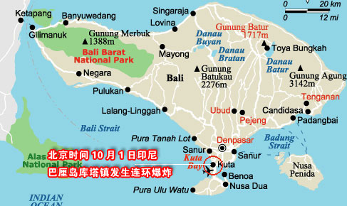 據(jù)當(dāng)?shù)孛襟w報道,巴厘島當(dāng)晚至少發(fā)生了3次爆炸,頭兩次爆炸發(fā)生在巴厘島金巴蘭區(qū)的一家餐館,第三次爆炸發(fā)生在庫塔鎮(zhèn),兩處都是游人較為集中的地方。爆炸還造成多座建筑物損壞。