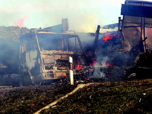 8時(shí)30分左右,一輛吊車趕到,在電石車左側(cè)拴上鋼索,將剩余的電石掀翻到路邊溝里,以便將燃燒的煤塊熄滅后清理。一個(gè)小時(shí)后,兩輛車的殘骸被運(yùn)走。