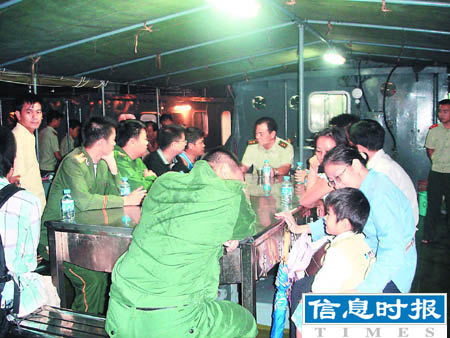 為了游客安全,邊防官兵當(dāng)機(jī)立斷,將“大飛”停在沙灘對(duì)開(kāi)的海面守候,兩條“中飛”迅速?zèng)_向沙灘,強(qiáng)行沖上沙灘接人!爸酗w”一沖上沙灘,邊防官兵迅速躍出艇外,只見(jiàn)沙灘上一片狼藉,邊防官兵迅速將手中抱著小孩的婦女先扶上艇,再將艇推到水較深的地方,啟動(dòng)摩托艇將被救游客接上“大飛”,這樣,兩條“中飛”先后共3次沖上沙灘將25名游客接走。