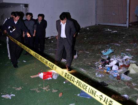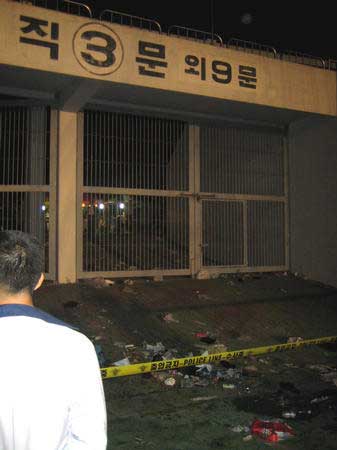 10月3日,有關(guān)人員在韓國(guó)尚州市市民體育場(chǎng)勘查踩踏事故現(xiàn)場(chǎng)。新華社發(fā)