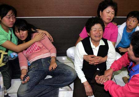 10月3日,在韓國(guó)尚州的醫(yī)院里,人們?cè)诎参坎忍な鹿视鲭y者的家屬。新華社發(fā)
