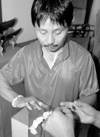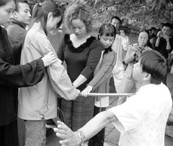 但昨日最吸引觀者眼球的當(dāng)屬趙門(mén)傳人王正安獻(xiàn)上的兩手絕活:“鎖喉鋼槍挑千斤”和“鐵指神功”。據(jù)了解,“鎖喉鋼槍挑千斤”還是首次在公開(kāi)場(chǎng)合亮相。