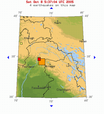 美國地質(zhì)勘測網(wǎng)站稱此次地震達(dá)到里氏7.6級,震中位于伊斯蘭堡東北部95公里和斯利那加西北部125公里地下10公里處。