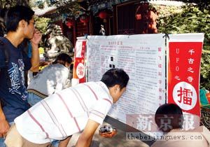 牌子放置在離北大西門不到10米遠(yuǎn)的便道上,長(zhǎng)約兩米,高約一米,上面寫著“為UFO正名”,兩邊各掛一面紅色的旗子,上寫“千古之奇,UFO之擂”。廣告牌前的男子自稱叫郭英森,今年50歲,初中未畢業(yè),1977年、1978年兩次參加高考都未被錄取,之前是撫順煤氣公司的管道工,2003年下崗。