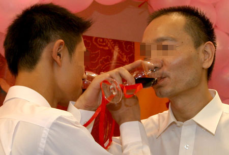 昨日近百人參加了李錦生、高杰的“虛幻慶典”,其中包括李錦生77歲的老父親、68歲的老母親。這對(duì)老人家坦然地、微笑著送上了祝福:“希望你們好好珍惜,能夠白頭到老,幸福地生活!崩铄\生的父親說,10余年前,他就知道了兒子的性取向,“當(dāng)時(shí)我也不能接受,我想讓他轉(zhuǎn)回來喜歡女性,不斷給他介紹女朋友等等,但無論怎樣努力也不能成功。后來慢慢想通了,只要他感到幸福,不做違法的事,好好工作對(duì)社會(huì)有所貢獻(xiàn),加上孝順父母,也就行了。”