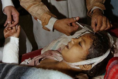 在巴基斯坦的曼塞赫拉,一名在地震中受傷的兒童被送進了當地的一所醫(yī)院。