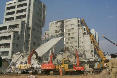 在8日發(fā)生的強烈地震中,巴基斯坦首都伊斯蘭堡一座10層的公寓樓發(fā)生坍塌,數百人被壓埋在瓦礫堆中。目前,20多臺重型機械設備正在現場輪番挖掘殘垣,爭取盡快搜救出受