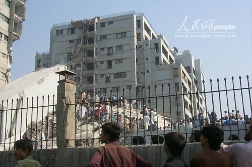 巴基斯坦首都伊斯蘭堡城區(qū)東部一座10余層高的公寓樓在8日上午發(fā)生的強烈地震中整體倒塌