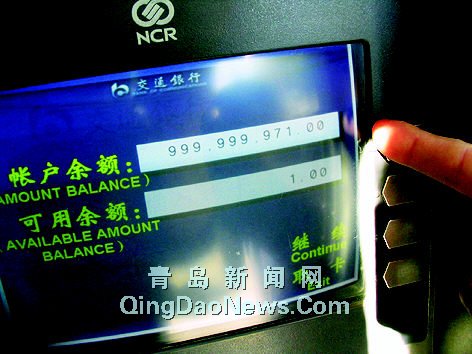 昨天上午,濟(jì)南來青島出差的馮先生偶然來到燕兒島路一家交通銀行的ATM機(jī)上檢查自己的銀行卡,他插卡輸完密碼后,屏幕上的顯示讓他不敢相信自己的眼睛———自己賬戶余額中竟然被一長串令人發(fā)暈的數(shù)字所替代,其中有好多個(gè)九,他反復(fù)數(shù)了幾遍,賬戶金額都是999999971.00。