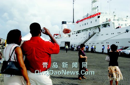 | “大洋一號”在牙買加首都金斯敦?科陂g,很多當地人在船前拍照留念(新華社發(fā)) |