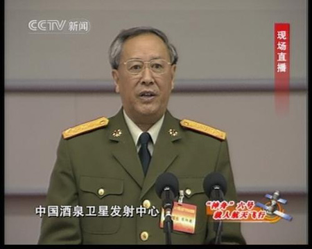 陳炳德:尊敬的胡總書記、溫總理,各位領(lǐng)導、各位來賓,同志們,根據(jù)航天城的測量結(jié)果,我現(xiàn)在鄭重宣布,神舟六號載人飛船發(fā)射取得圓滿成功。