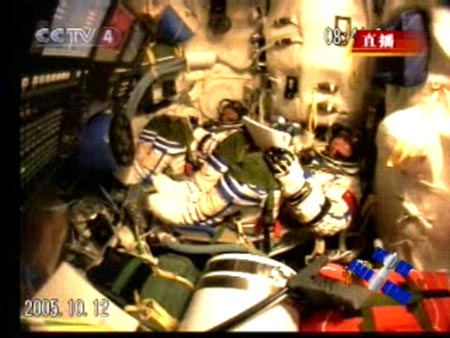 兩位宇航員在飛船內 兩位宇航員進入飛船,準備發(fā)射。圖為宇航員在飛船內電視截圖