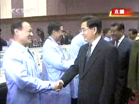 中新網(wǎng)10月12日電 胡錦濤等中央領(lǐng)導(dǎo)同志與北京航天飛行控制中心工作人員親切握手,熱烈祝賀神舟六號發(fā)射成功。