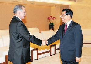 10月12日,國家主席胡錦濤在南京會(huì)見應(yīng)邀出席第十屆全國運(yùn)動(dòng)會(huì)的國際奧委會(huì)主席羅格。 新華社記者 樊如鈞攝