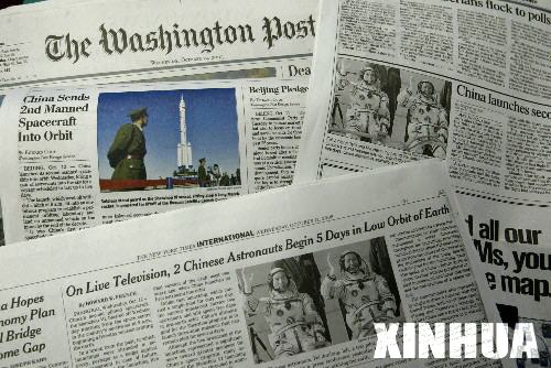 10月12日出版的美國主流媒體《華盛頓郵報》(左上,11版)、《華盛頓時報》(右上,16版)和《紐約時報》(下,5版)對中國神舟六號飛船發(fā)射 進(jìn)行了報道。 新華社記者呂明響攝 責(zé)任編輯 張偉明