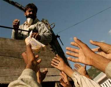 10月12日,巴基斯坦救援人員向?yàn)?zāi)民分發(fā)食物。