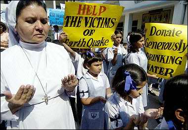 10月12日,一名巴基斯坦基督教老師帶著她的學(xué)生為遇難者祈禱。