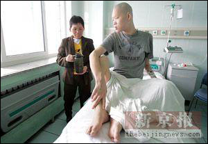 去年12月劉麗突然失明并昏迷,被送往醫(yī)院。今年9月23日她來北京做手術(shù)。原來體重126公斤的劉麗一下瘦了40斤,3個(gè)月沒下床了,小腿肌肉開始萎縮,膝關(guān)節(jié)顯得額外粗大。