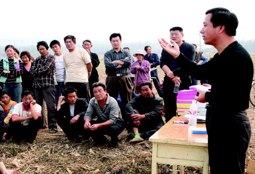 10月13日,棗莊市山亭區(qū)聘請的山東農(nóng)業(yè)大學農(nóng)學院副院長、農(nóng)學博士賀明榮(右一)在地頭為農(nóng)民講解有關小麥新品種及科學種植技術。三秋生產(chǎn)到來之際,山亭區(qū)組織農(nóng) 技人員到田間地頭辦起科技培訓班,向農(nóng)民介紹適合當?shù)胤N植的小麥優(yōu)良品種,傳授科學的管理措施,為農(nóng)民當好科技參謀。新華社發(fā)