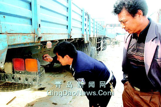 122指揮中心一位姓李的警官介紹,7時40分,他們接到了舉報后,立即向執(zhí)勤民警發(fā)出指令,全力追查逃逸車。李警官說,兩位男青年被刮后一下坐在路上,不久他們就爬起來走了。胡女士的班車則一直跟在逃逸車后面,她邊追邊跟警方舉報方位。上午8時許,蘇FR1000貨車行駛到308國道中嶗路段時,被李滄交警攔住。隨后,駕駛?cè)隋X某和車輛被市北交警大隊遼源路中隊帶走。在接受訊問時,該車駕駛?cè)隋X某拒不承認(rèn)刮倒人的事。負(fù)責(zé)處理此事的孫增舉警官介紹,他們在貨車后車燈罩處發(fā)現(xiàn)了幾處新擦痕(上圖),“這很可能就是發(fā)生刮擦事故的接觸點(diǎn)!