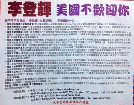 據(jù)港媒報道,該廣告大字標題寫著“李登輝美國不歡迎你”,其中力數(shù)了李登輝9個“背叛”,即背叛同志、同學、妻子,背叛蔣經(jīng)國、中國國民黨和黨員,背叛臺灣和中華民族,甚至背叛了上帝。