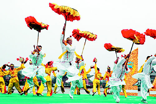 10月17日,來(lái)自甘肅蘭州的代表隊(duì)在表演《鼓舞太平》鼓舞。    當(dāng)天,來(lái)自全國(guó)各地的22支鑼鼓隊(duì)齊聚山西臨汾,參加中國(guó)民間鼓舞鼓樂(lè)展演。新華 社發(fā)