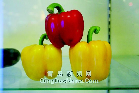 農(nóng)交會上有些產(chǎn)品是用來展示的,雖然不能“據(jù)為己有”,但也可以讓人大飽眼福。昨天,農(nóng)交會上的紅色“青椒”和黃色“青椒”就讓紀(jì)春玲感到很驚奇。據(jù)參展方平度市崔家集鎮(zhèn)坊頭村農(nóng)民蔬菜協(xié)會工作人員介紹,它們分別叫方舟、白公主,都是新培育的品種。萊西的壽桃也來助興了,“中華壽桃”小的有半公斤,大的近1公斤,讓人垂涎欲滴。