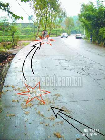“我和陳曉斌都是樂(lè)山匯運(yùn)駕校的教練,17日中午,我們按教學(xué)計(jì)劃,由陳曉斌騎一輛‘太子125’型摩托車到犍為縣定文鎮(zhèn)招收學(xué)員。當(dāng)駛出犍為縣城約4公里,路經(jīng)‘伏兒溝’路段左轉(zhuǎn)彎上坡時(shí),一輛銀白色、車牌號(hào)為‘川L77555’的寶來(lái)轎車為超越前面一輛貨車從坡上沖了下來(lái),將我們前面行駛的一輛車牌號(hào)為‘川LN3119’的‘五羊125’撞翻,摩托車駕駛員被撞飛到路邊的排水溝里!币?yàn)樾貝灒疚湔f(shuō)話顯得有些吃力,“見(jiàn)此情形,陳曉斌立刻將摩托車靠邊停下。但寶來(lái)車將‘五羊125’撞翻后并未停下,徑直向我們沖過(guò)來(lái)!椤囊宦暰揄!還沒(méi)來(lái)得及反應(yīng),我就被撞飛到路邊的草坡上。我忍痛坐了起來(lái),看到陳曉斌已經(jīng)被撞飛到草坡下一個(gè)離公路約2米高、4米遠(yuǎn)的深坑里,無(wú)法動(dòng)彈。這時(shí),白色寶來(lái)也停下了,駕駛員下車看了看被撞傷的3個(gè)人,就開(kāi)始打電話,我沒(méi)聽(tīng)清楚他說(shuō)什么!