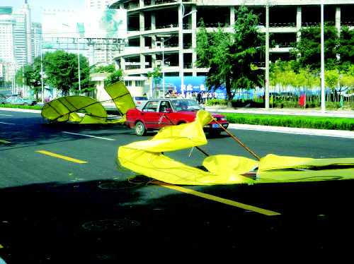 據(jù)一位目擊者介紹,這些鐵質(zhì)廣告牌是從正在建設(shè)中的高達(dá)20多層的國華大廈落下的,是大廈的“售樓熱線”數(shù)字,每個數(shù)字都有10多斤重。楊海濤攝影報道