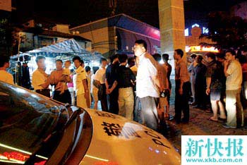 前晚7時40分,記者趕到現(xiàn)場看到,華苑商業(yè)市場牌坊前的空地已被警戒線圍了起來,周圍聚集了數(shù)百名圍觀者,小剛的尸體仍停在空地上,四周放了四把大遮陽傘。