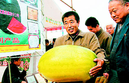 日前,第25屆全國種子交易會在濟南王舍人鎮(zhèn)幸福柳廣場拉開帷幕。來自全國28個省、市、自治區(qū)的500多家單位帶著名優(yōu)良種會聚濟南,3000余客商前來參加。圖為商家展示 的45公斤重的西瓜,吸引不少人一試身手。.王麗趙世峰攝