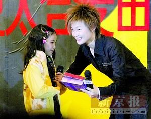 每次李宇春出席活動,主辦方總要請些“特殊玉米”前來捧場,這次也不例外,當(dāng)主持人說出“這位上海遠道而來的玉米是……”不少人以為是在超女總決賽中有著“出色表現(xiàn)”的夏奶奶,不料出場的卻是位8歲的小玉米。披著長發(fā)的小姑娘穿著黃色的玉米裝,主持人和李宇春看著如此可愛的小姑娘喜笑顏開,更希望這位小玉米能發(fā)揚“小鬼當(dāng)家”精神,用童言無忌將熱鬧的現(xiàn)場氣氛再創(chuàng)高潮。