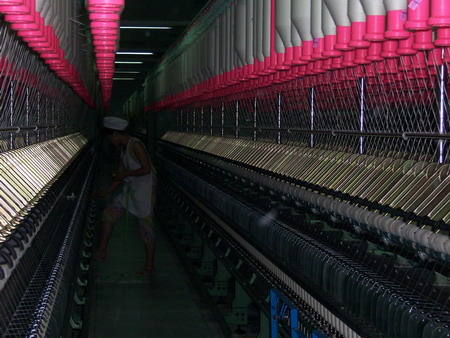 紡紗車間里紡織女工正在辛勤勞作,由于車間溫度較高,車間工人即使在冬天也穿著短袖工作