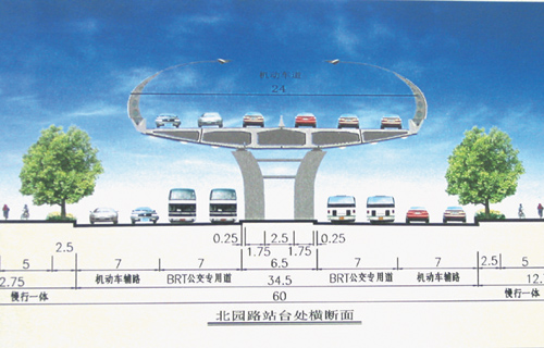 北園大街建設(shè)采用“雙快”組合模式,建設(shè)復(fù)合型城市走廊。其中快速路采用高架形式,雙向六車道;地面道路雙向六車道,中間兩條為BRT車道,另外四條為社會機(jī)動車道。全線共設(shè)BRT站點(diǎn)20個,平均間距608米。初步確定由市公交公司(占股51%)與法國康運(yùn)思公司(占股49%)成立BRT運(yùn)營公司。