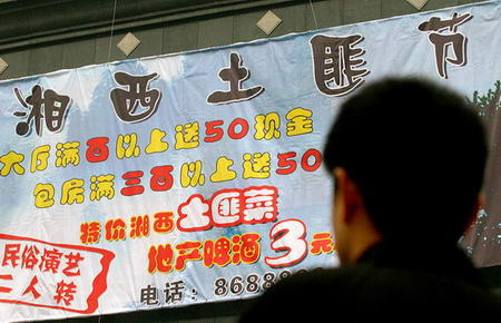 昨日上午,在長(zhǎng)春市南關(guān)區(qū)全安廣場(chǎng)附近,一家飯店門前掛著一條長(zhǎng)約三米、寬五米的巨幅戶外廣告,廣告條幅上清晰地寫著“湘西土匪節(jié)”、“特價(jià)湘西土匪菜”等字樣,引得路人紛紛側(cè)目。