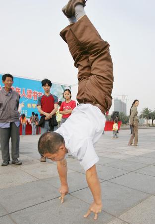10月28日,來自重慶的阮興祥先生在浙江溫州世紀(jì)廣場展示他的雙手“二指禪”功夫。阮先生今年50歲,身高1.6米,體重60公斤。他自小酷愛武術(shù),從1980年起經(jīng)過近20年的鍛煉,終于練成雙手二指倒立的功夫。