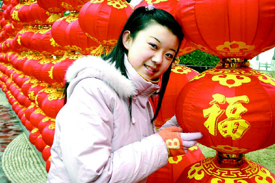 17日在濟(jì)南市大明湖風(fēng)景區(qū)內(nèi),一名游客在大紅“!弊譄艋\前留影。目前,該公園入園處掛起了千余盞大紅燈籠。新華社發(fā)