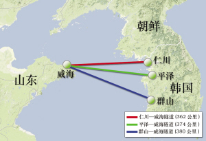 據(jù)悉,京畿道制定了3套方案:仁川—威海隧道(362公里)、平澤—威海隧道(374公里)、群山—威海隧道(380公里)。分析認(rèn)為,其中港口靠泊條件較為突出和較容易建設(shè)物流基地的平澤—威海隧道最為可行。