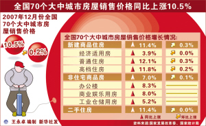 ????? 本報(bào)訊 據(jù)國家發(fā)展改革委、國家統(tǒng)計(jì)局調(diào)查顯示,2007年12月,全國70個(gè)大中城市房屋銷售價(jià)格同比上漲10.5%,漲幅與上月持平;環(huán)比上漲0.2%,漲幅比上月降低0.6個(gè)百分點(diǎn)。