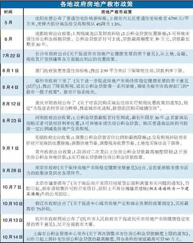 ????南方報業(yè)傳媒集團(tuán)-南方日報 為促使樓市回暖及恢復(fù)市場信心,近日全國地方政府救市大潮愈演愈烈,繼南京、西安、重慶等市之后,杭州市政府出臺拯救樓市的“24條”意見,上海公積金管理中心網(wǎng)站也貼出了上調(diào)補充公積金貸款額度一倍的通知。 據(jù)不完全統(tǒng)計,目前全國已有17個地方政府紛紛以減稅、推行貨幣補貼及降低準(zhǔn)入門檻等一系列積極的利好政策,以期市場重回健康的軌道。廣州、深圳雖沒有正式出臺文件,但在土地供應(yīng)規(guī)模、限價房上市等方面明顯加強了政府的調(diào)控力度。