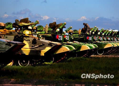 “和平使命——2009”中俄聯(lián)合反恐軍事演習將于7月26日進入高潮,目前中俄參加演習主戰(zhàn)裝備以良好的狀態(tài)嚴陣以待,這些即將馳騁疆場的金戈鐵馬,暫時融入了大草原的寂靜(中新社發(fā) 宋吉河 攝)