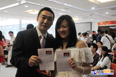 一對(duì)新人如愿以償,在“999”拿到了結(jié)婚證 ????青島新聞網(wǎng)9月9日訊 今日是2009年9月9日,記者在市北區(qū)婚姻登記處看到,前來登記結(jié)婚的準(zhǔn)夫妻們排滿了走廊,一派喜氣洋洋的景象,現(xiàn)場工作人員的午餐放在桌上成了冷飯。據(jù)統(tǒng)計(jì),市內(nèi)四區(qū)預(yù)約9月9日登記的新人超過1000對(duì),預(yù)計(jì)今日結(jié)婚登記的夫妻將破2000對(duì)大關(guān),比肩“八八八(2008年8月8日)。 ????截至記者發(fā)稿時(shí),市南婚姻登記處已辦理婚姻登記50 ????市北婚姻登記處負(fù)責(zé)人陳梅對(duì)記者說:“為了讓所有的人都能在今天登上記,我們已經(jīng)連續(xù)好幾天加班了,特設(shè)了供老人、軍人、殘疾人的綠色通道;為引導(dǎo)情侶,制作了指示牌;照相、攝像器材做了更換和備份,確保登記工作高效率運(yùn)作?!保ㄇ鄭u新聞網(wǎng)記者 周琦) |