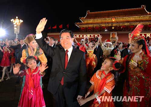 ????10月1日,首都各界慶祝中華人民共和國成立60周年聯(lián)歡晚會在北京天安門廣場舉行。這是中共中央總書記、國家主席、中央軍委主席胡錦濤走出天安門城樓,來到群眾中間。(新華社記者 蘭紅光 攝)