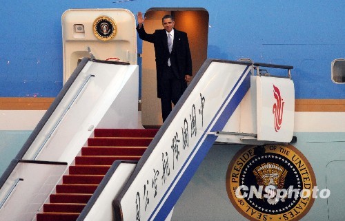 ????11月16日,正在中國(guó)訪問的美國(guó)總統(tǒng)奧巴馬乘坐空軍一號(hào)專機(jī)從上海飛抵北京首都國(guó)際機(jī)場(chǎng)。 中新社發(fā) 廖攀 攝