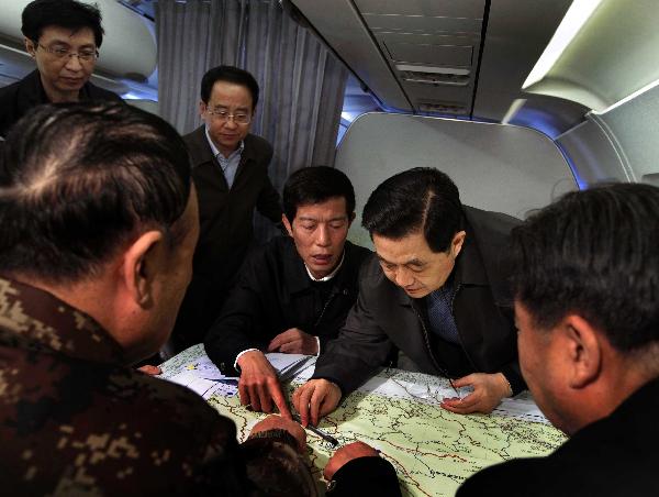 飛機在高速飛行。機艙內(nèi),中共中央總書記、國家主席、中央軍委主席胡錦濤專注的目光,聚焦在地圖上一個讓人揪心的地方——
