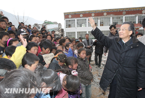 4月16日清晨,溫家寶乘車前往玉樹州孤兒院看望他牽掛的兒童們。這是臨別時,溫家寶一步三回頭,與孩子們依依惜別。當日,中共中央政治局常委、國務(wù)院總理溫家寶繼續(xù)在青海玉樹地震災(zāi)區(qū)考察,他深入受災(zāi)嚴重的學(xué)校、孤兒院、寺廟,到受災(zāi)群眾集中安置點看望慰問各族群眾,代表黨中央、國務(wù)院向受災(zāi)群眾致以深切慰問。新華社記者樊如鈞攝