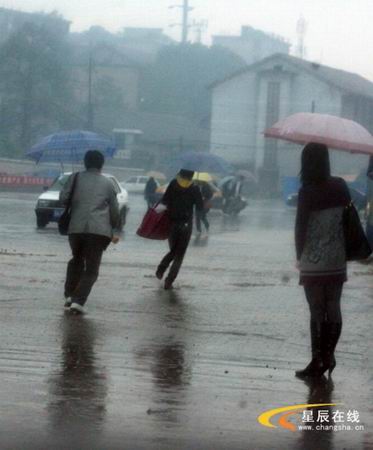 ????20日晚開(kāi)始,長(zhǎng)沙開(kāi)始下起大雨。昨天早晨整個(gè)長(zhǎng)沙城籠罩在暴雨中。8時(shí)許,暴雨沖刷著長(zhǎng)沙大街小巷,給出行的市民帶來(lái)極大不便?!皳蝹愣紱](méi)用,我就在公交車站等了一會(huì)兒車,鞋子、衣服、褲子全濕了?!闭ド习嗟暮〗阏f(shuō)。