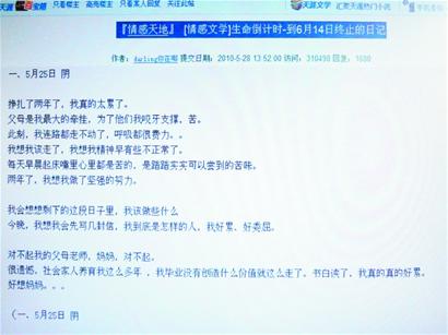????昨天,記者在該論壇上看到,該帖的第一篇日記記錄的是5月25日,帖子中稱,“很遺憾,社會家人養(yǎng)育我這么多年,我畢業(yè)沒有創(chuàng)造什么價值就這么走了。書白讀了,我真的真的好累……”