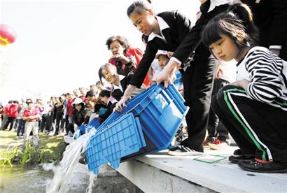 ????早報(bào)訊 鰱魚(yú)、草魚(yú)、鯽魚(yú)、泥鰍“安家”李村河,昨天,李滄區(qū)在剛剛美化的李村河上游放入了1.8萬(wàn)條魚(yú)苗,這些魚(yú)兒不僅可以改善河道的環(huán)境,還將擔(dān)負(fù)起一項(xiàng)重任:“預(yù)警”水質(zhì)狀況,今后一旦有污水進(jìn)入河道,這些魚(yú)兒會(huì)率先發(fā)出“警報(bào)”,環(huán)保部門(mén)工作人員將立即采取行動(dòng)。